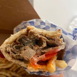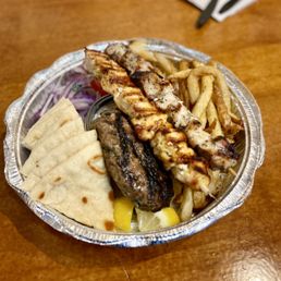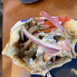 Tasty food and good portions. The beef-lamb gyro was exactly was loaded with a ton of meat. It was very good, but a bit more veg and fries would have taken it over the top. I got a side of falafel. I like them fried until the exterior forms a hard crust, which they were. My friend ordered a massive plate of meat, salad, and fries. It was good for almost two meals. They have some outside seating. Their parking lot is definitely not the most scenic, but they have an awning with plants which makes it actually quite nice.